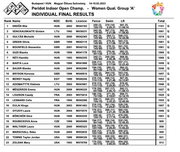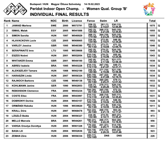 Avec un total de 1031 points, Clémence REBOISSON se qualifie en terminant à la 14e place de la qualification B. Une escrime avec 8 victoires pour 14 défaites, un temps de natation de 2’22’65 lais surtout le deuxième meilleur temps de sa série en Laser Run (12’08”05) lui permettent de se qualifier pour la demi-finale.