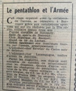 Le pentathlon militaire n’est pas une discipline olympique, mais sa diversité ressemble au pentathlon moderne qui est une discipline olympique. Aussi, compte tenu de nos bonnes performances en pentathlon militaire, Jean-Pierre GIUDICELLI et moi sommes retenus pour nous essayer dans cette nouvelle discipline.
