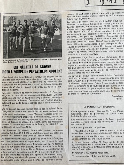 Dans l’équipe de 1968 médaillée de bronze, il était accompagné du regretté Jean-Pierre GIUDICELLI qui nous a quitté le 28 avril dernier et Raoul GUÉGUEN ainsi que Christian CHÂTILLON qui était le remplaçant. On remercie grandement Lucien GUIGUET pour ce témoignage fort dans ce qu’était le pentathlon à l’époque et ses origines militaires, le programme intense des différents stages… Vous allez avoir ensuite des anecdotes croustillantes sur les JO de Mexico. Bonne lecture !