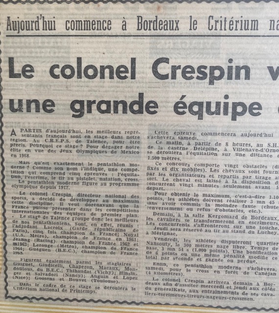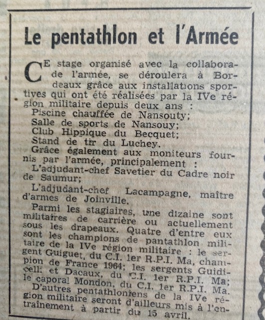 Jean-Pierre GIUDICELLI, que je surnommais Juju, et moi sommes donc retenus pour un stage de pentathlon moderne à Pâques 1966 au CREPS de Talence. Nous y faisons la connaissance de Raoul GUÉGUEN, le fils aîné du Commandant Émile GUÉGUEN ainsi que du lieutenant de cavalerie Christian CHÂTILLON, fraîchement débarqué d’Allemagne où il était en garnison au 5e régiment de hussards. Il y avait également quelques autres militaires venus tester leurs aptitudes comme nous afin de constituer un premier vivier.