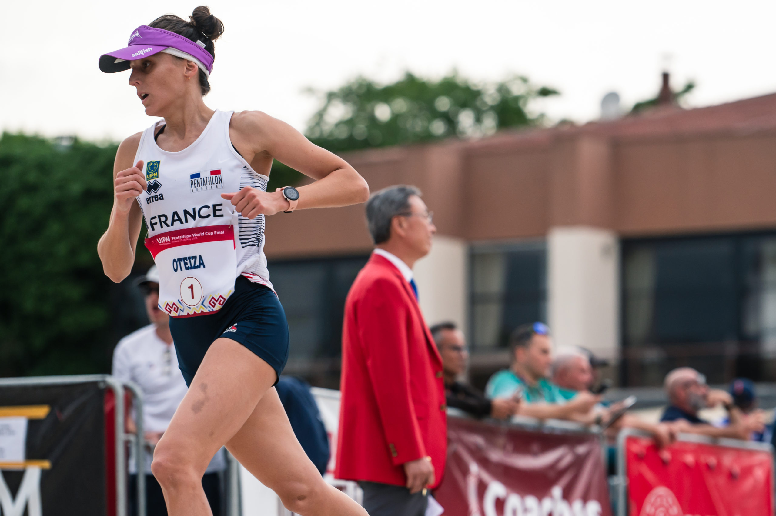 Les points cumulés des 3 premières épreuves (escrime, natation et équitation) vont déterminer l’ordre et l’intervalle des départs. Les pentathlètes doivent effectuer 5 tours de 600 mètres avec quatre arrêts au stand de tir.